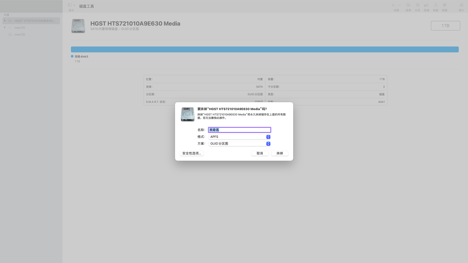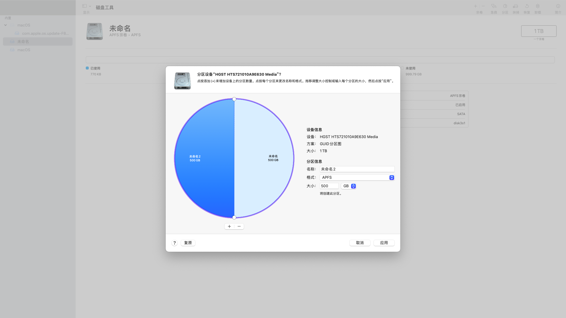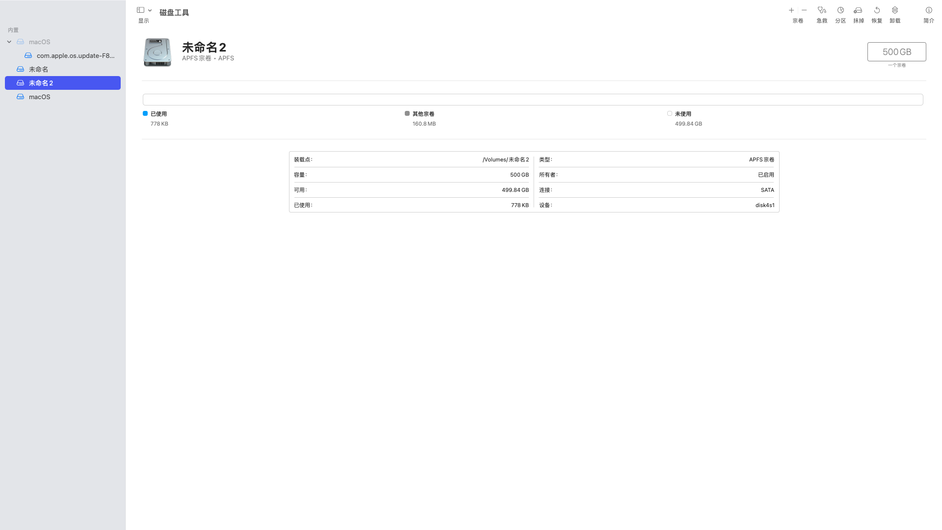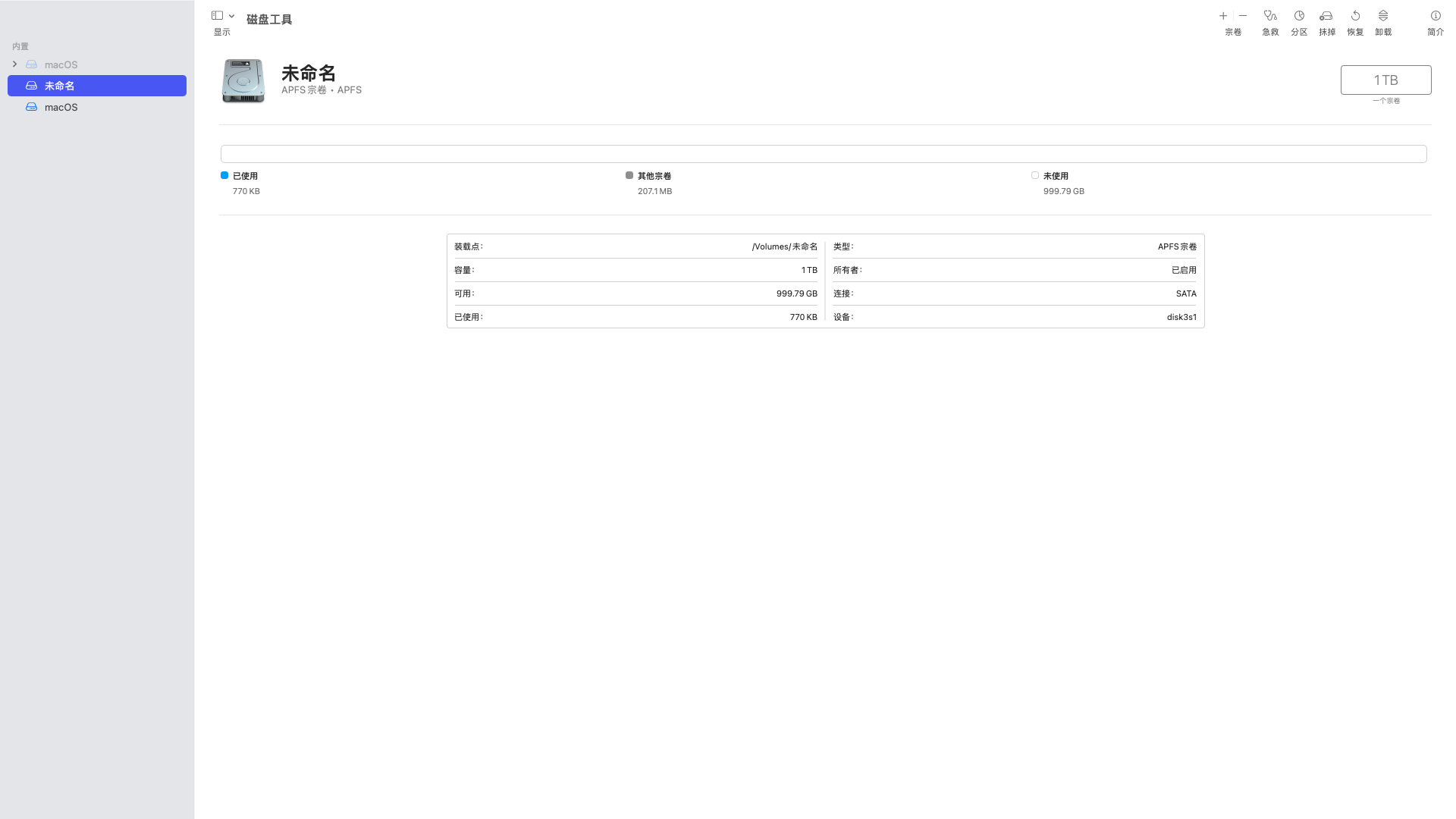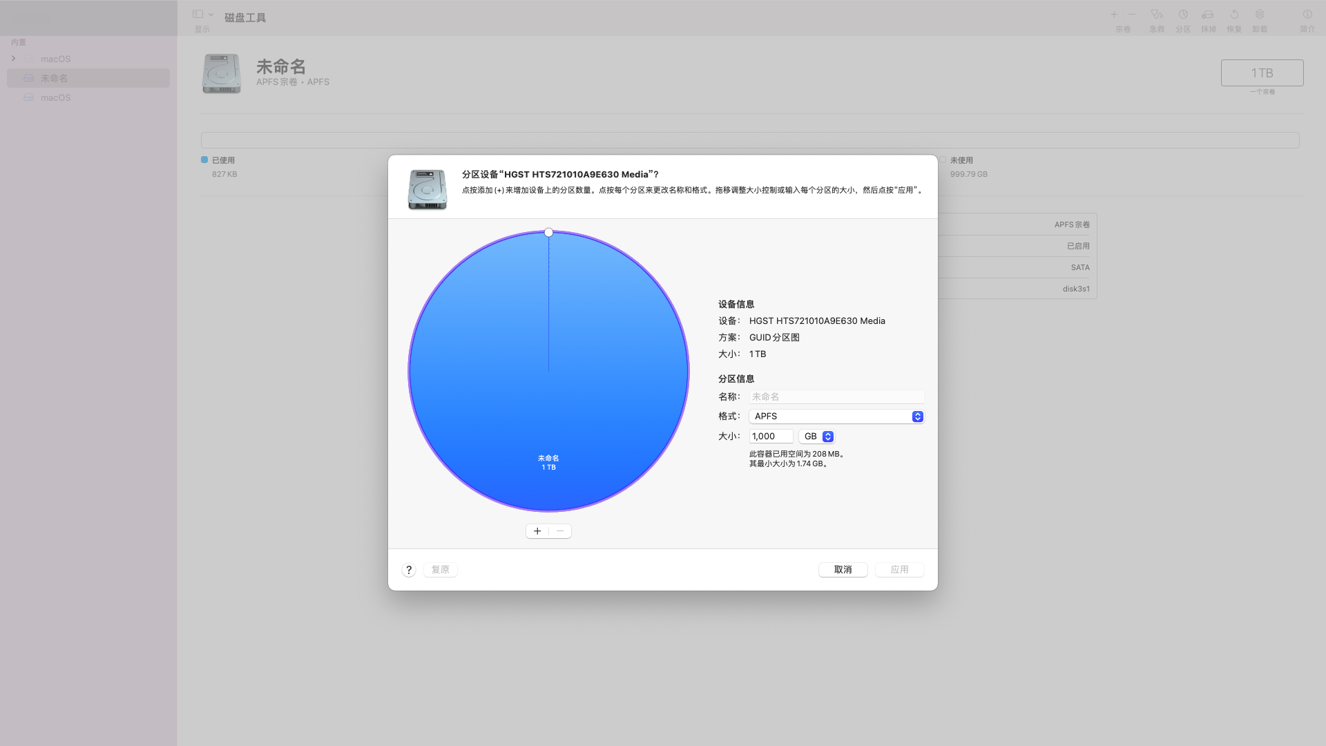首页 硬盘 Mac OS新硬盘初始化和分区2022/9/28 一、进入磁盘工具 方式一 依次进入“访达”(Dock栏内最左侧蓝色笑脸的图标) – “其他(文件夹)”,即可找到“磁盘工具”。 ①②③ 上一个 下一个 方式二 在顶部菜单栏依次进入“前往” – “实用工具”,即可找到“磁盘工具”。 ①② 上一个 下一个 二、“抹掉”硬盘 新硬盘进行“抹掉”后,方可正常识别到可用容量和使用,如需增加硬盘的分区数量,可参照硬盘分区步骤。点击磁盘工具内右上角的“抹掉”按钮;输入文字进行“名称”的设置;“格式”:推荐使用“APFS”格式¹,外置存储设备如需在Windows和Mac OS使用推荐“exFAT”格式;“方案”选择“GUID分区图”;名称、格式、方案设置完毕后点击“抹掉”,等待系统自动完成即可。[1]Mac OS磁盘使用手册 ①②③④⑤⑥⑦ 上一个 下一个 三、硬盘分区 点击磁盘工具内右上角的“分区”按钮;点击饼状图下方的“➕”按钮;修改“分区信息”内的“名称”、“格式”和“大小”,修改完毕后点击“应用”;在弹出的提示依次点击“添加分区” – “分区”;等待系统自动完成即可完成硬盘的分区。 ①②③④⑤⑥⑦ 上一个 下一个