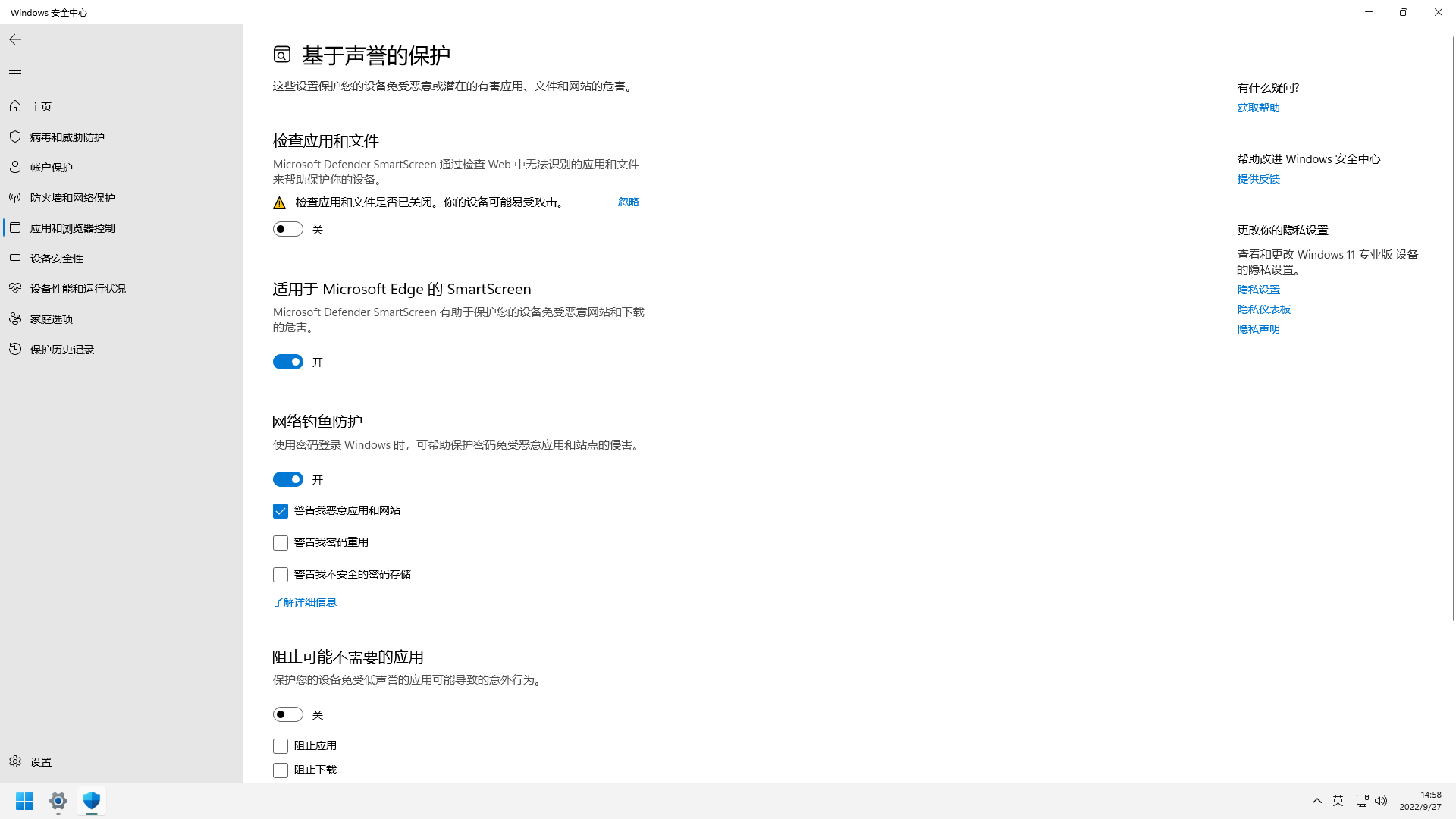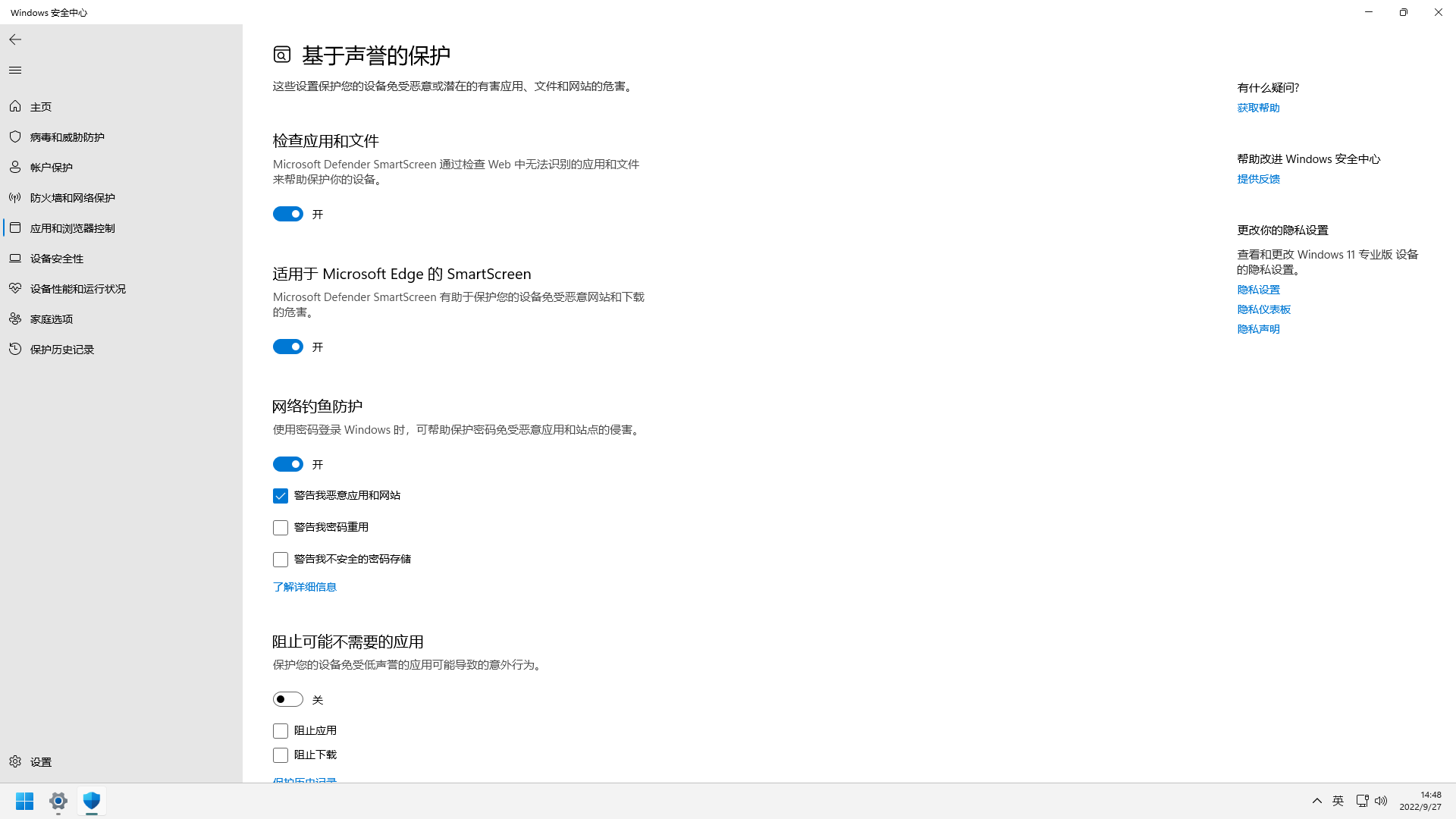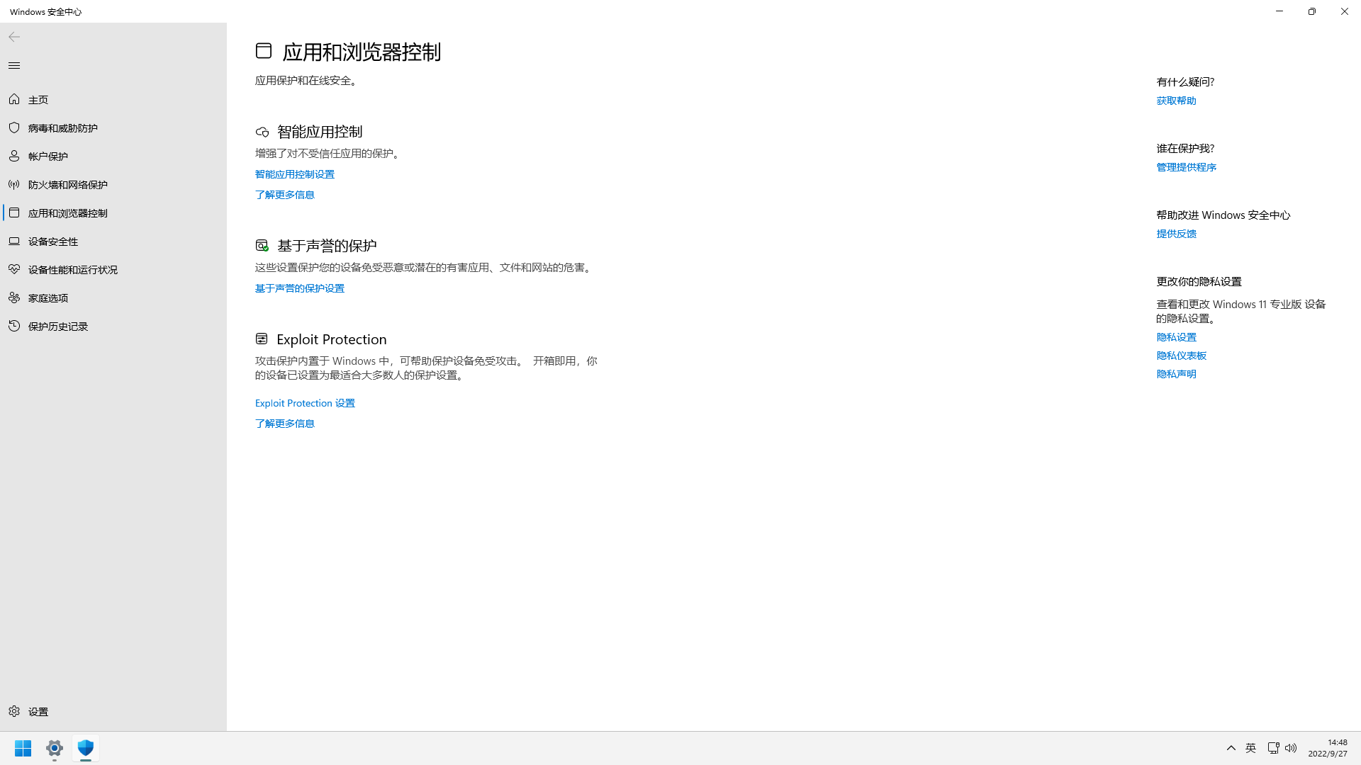 2. 依次点击“应用和浏览器控制” – “基于声誉的保护设置”;