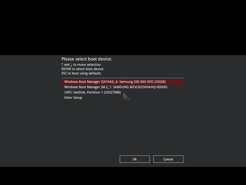 - 按下开机键后,反复点按快捷启动热键,使用键盘上的方向上下键,将光标移动至U盘选项(根据U盘品牌来判断哪一个选项是U盘,推荐前缀是UEFI的选项)并按下“回车键”,等待自动进入到WinPE桌面。